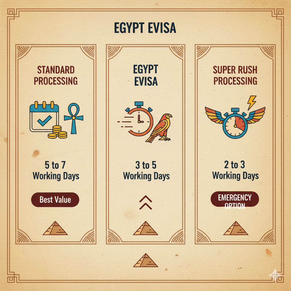 We know that sometimes travel plans happen at the last minute. Depending on your urgency, there are three main processing speeds for the Egypt eVisa: